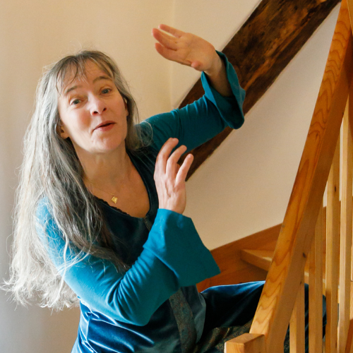 Sie erzählt Mythen, Märchen und eigene Geschichten für Erwachsene und Kinder, auf der Bühne, in kleinen Runden und im Stadtraum.